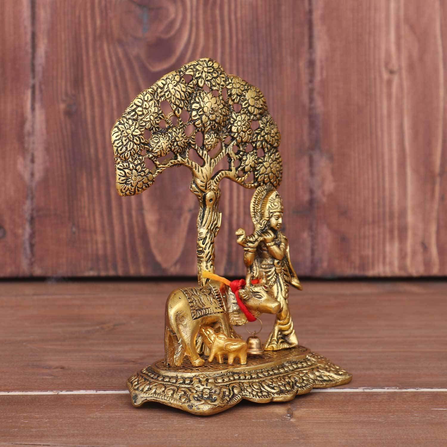 Kriyanta Prince Home Decor Metal Krishna with Cow Under Tree Playing Flute Figurine (Gold, 12.5x8x16cm)
