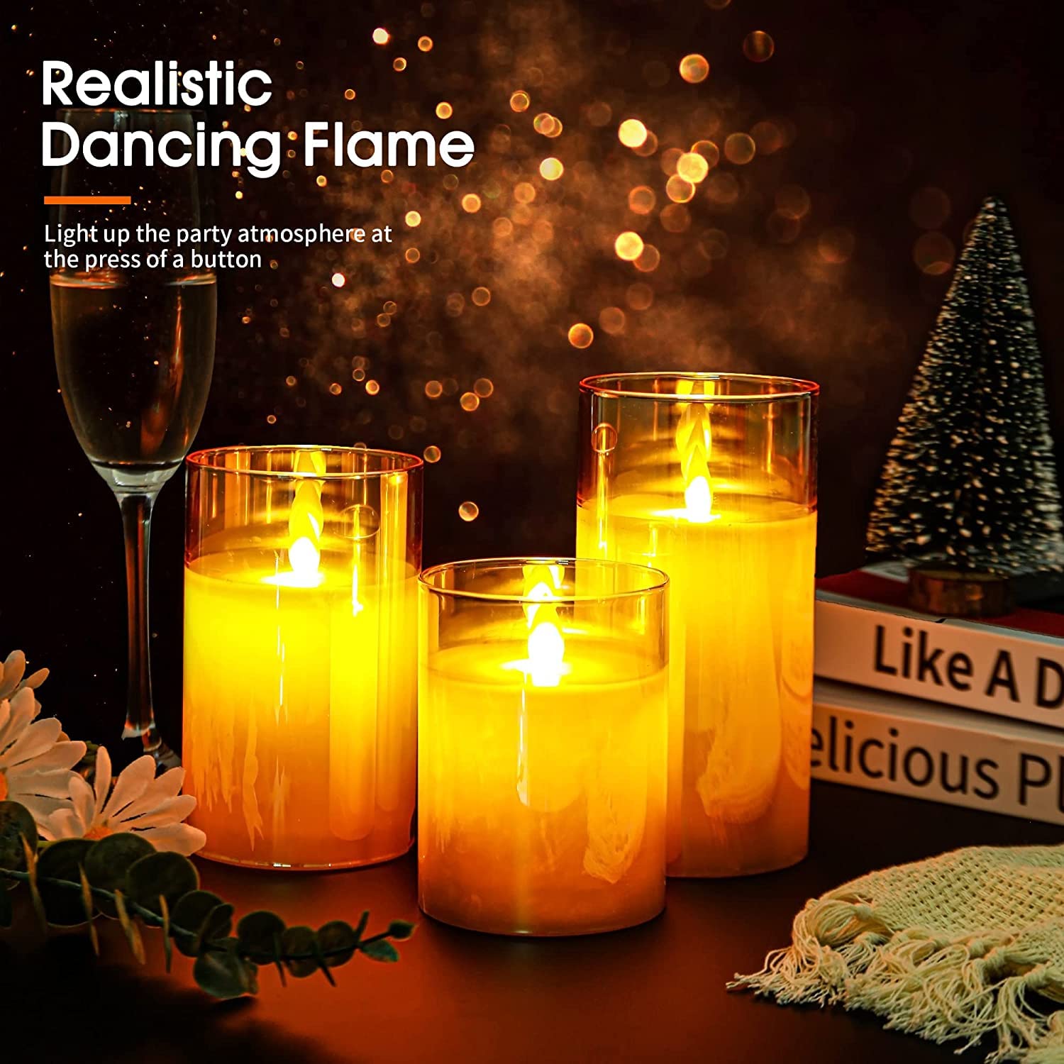 Lumora Real Wax LED Glass Flameless Candles with Remote, Amber Gold Pillar Design, Set of 3 for Home Decor
